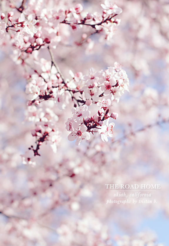 We were supposed to just drive by Ukiah, California we did after all have a hotel booked in charming Petaluma, but my husband was tired and we were both cranky with hunger. I can tell you it's not easy finding a motel that accepts dogs at the 11th hour. We ended up pulling up to a motel that took dogs and looked like it was free from bed bugs. My husband kept assuring me that bed bugs only live on the East Coast, but I think he was just saying that to assuage my mania. When we drove into the parking lot in the dead of night I couldn't see two feet ahead of me, so I didn't know that I would wake up to find these cherry blossoms blooming in between the blacktop. We woke up very early the next morning and the air was thick with haze and soft sunlight, there were so many blooms that everything had a rosy, pink hue to it. It was quite the sight and will be what I file in my memory bank about Ukiah, gosh knows I want to forget about the nearly $30 pizza we ordered that had a burnt bottom and tasted like sugar coated cardboard.